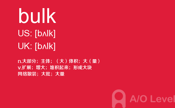 a-level课程适用于年龄在15—18之间,初中毕业以上的在校中学生或具有同等学历的职高生,通常国内a-level学校招收的是高二毕业的学生,并要求参加相关的入学考试,由于a-level课程包括教学及试卷习题等都是英文形式出现,所以这要求学生有较高的英文水平。对于a-level考试适用对象有初步了解之后,下面alevel考试网给大家带来的alevel考试中你需要重点记住的单词bulk的详细介绍。如果您想了解英国alevel课程是什么,alevel经济学章节总结,alevel可以申请哪里,alevel阅读评分等关于a-level考试的相关资讯,请继续浏览并关注课窝a/o-level考试网。