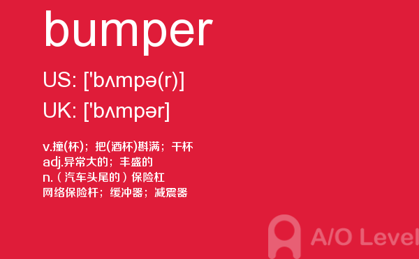 a-level课程证书被几乎所有英语授课的大学作为招收新生的入学标准。 在中国开设a-level课程旨在为中国学生提供进入国外大学的有效途径,具体目标为:培养在国内初高中成绩优秀的学生进入世界顶尖大学;培养在国内初高中成绩中等的学生进入世界一流大学;培养在国内初高中成绩一般的学生考取适合自己的大学。今天alevel考试网小编给大家详细解析a-level考试单词bumper。如果您想了解新加坡a水准考试科目,国际高中的课程alevel,高考完新加坡a水准,新加坡a水准报名费等关于a-level考试的相关资讯,请继续浏览并关注课窝a/o-level考试网。
