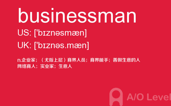 随著学生的素质提升,各大a-level课程培训班的师资和英国a-level题库也不断的完善,近年来学生考出来a-level分数也不断上涨。但是去英国留学,对英国留学资讯和英国的a-level考试资讯都是需要了解的,下面一起跟着a/o-level考试网来看看a-level词汇之businessman的详细介绍。如果您想了解alevel考试费用,a水准一年,alevel英语是什么,新加坡a水准学费等关于a-level考试的相关资讯,请继续浏览并关注课窝a/o-level考试网。